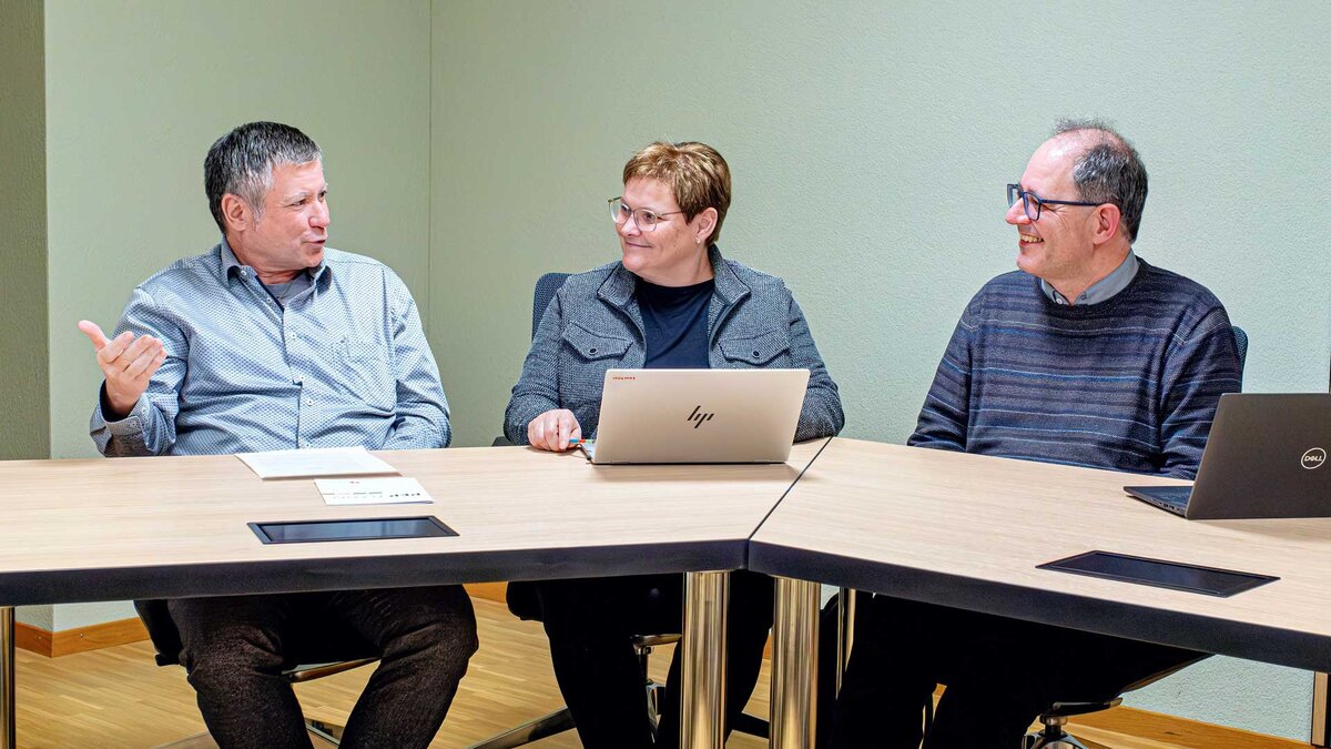 «Kirchenentwicklung ist auch eine Frage des Vertrauens»: Bischofsvikar Hanspeter Wasmer (links) im Gespräch mit Synodalrätin Annegreth Bienz-Geisseler und Detlef Hecking, Pastoralveranwortlicher des Bistums. | Bild: Gregor Gander