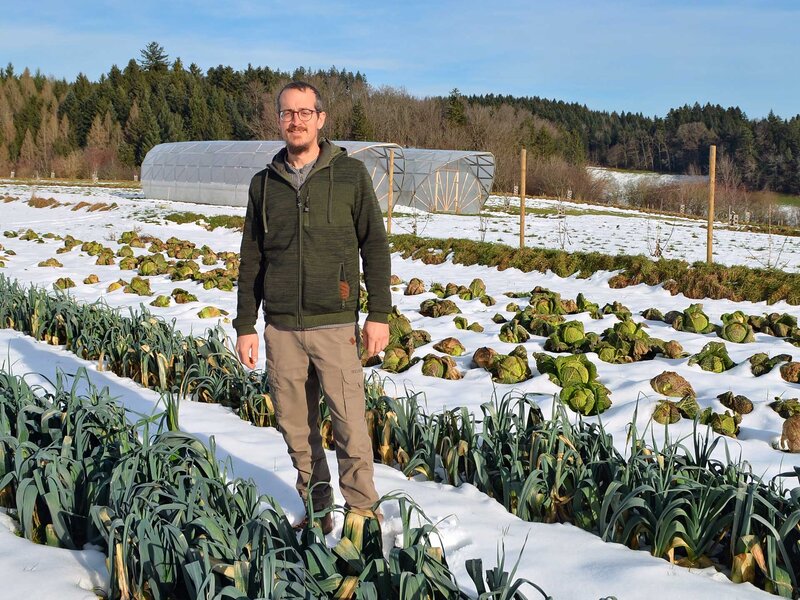 «Leider geht die Sortenvielfalt weltweit stark zurück»: Markus Schwegler auf seinem Gemüsefeld. | Bild: Matteo Hug